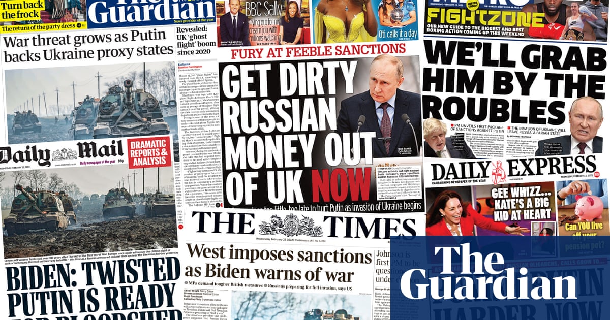 The Times says “West imposes sanctions as Biden warns of war” and carries an image of Russian troops and tanks in the Rostov region, close to the border with Ukraine. It reports the US president’s comment that Russia’s military is moving blood supplies to the border, and disquiet among some senior Tory figures over the extent of the UK sanctions. Continue reading...